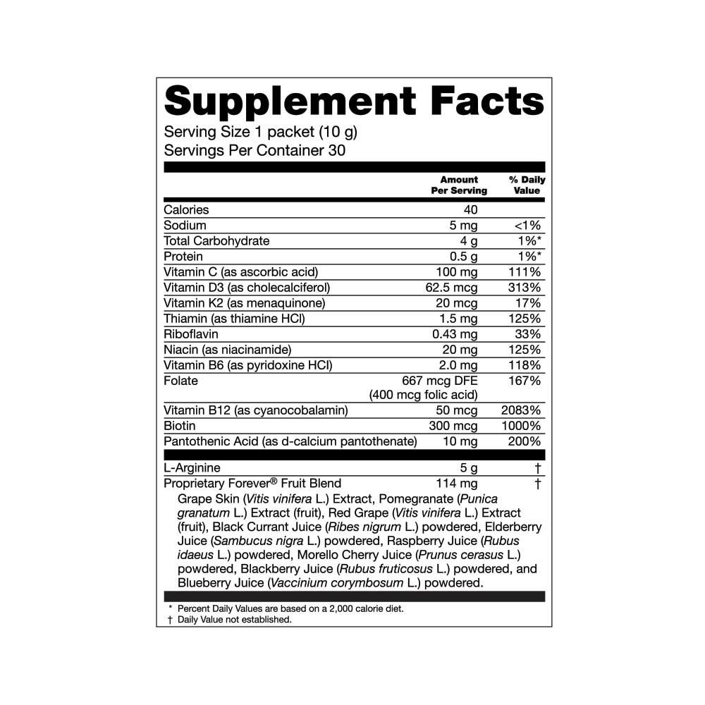 • روزانه یک ساشه (۱۰ گرم) را با ۲۴۰ میلی‌لیتر آب،Forever Aloe Vera Gel، یا Forever Aloe Berry Nectar مخلوط کرده و میل کنید.